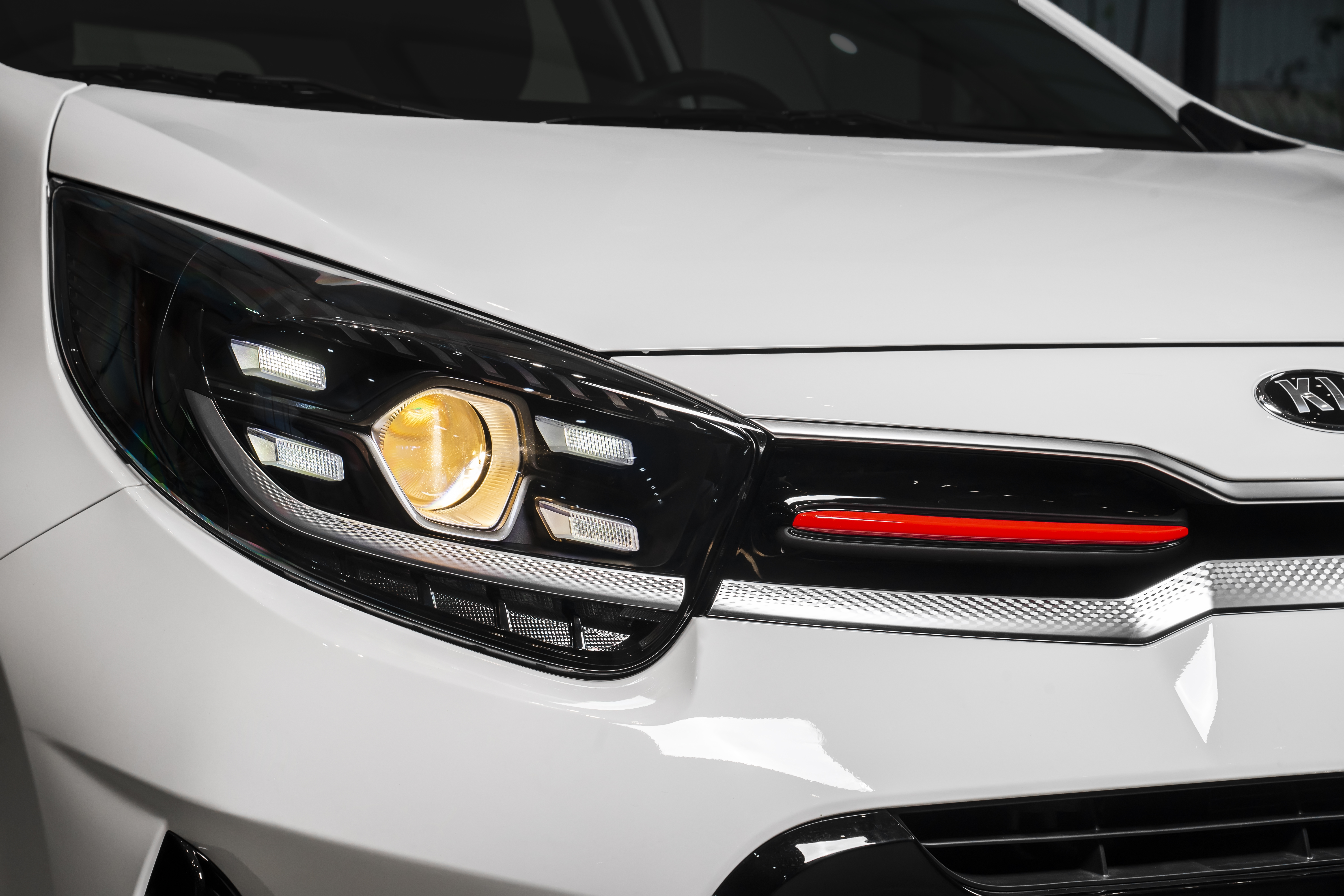 Ngay từ phần đầu xe, KIA Morning 2021 đã tạo ấn tượng với trang bị lưới tản nhiệt hình mũi hổ đặc trưng được tinh chỉnh với viền mạ crôm bao quanh kéo dài đến cụm đèn pha cũng được tái thiết kế. Đặc biệt, bản KIA Morning GT-Line này còn có thêm chi tiết trang trí màu đỏ ở giữa lưới tản nhiệt, viền trang trí dạng kim loại thiết kế ấn tượng giống trên mẫu xe KIA Seltos. Dải đèn LED ban ngày gồm 4 bóng đèn bao quanh đèn chính dạng gương cầu trông thiết kế hiện đại.